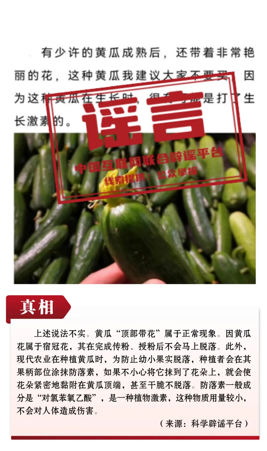 谣言10:黄瓜顶部带花是因为打了激素,不能吃?
