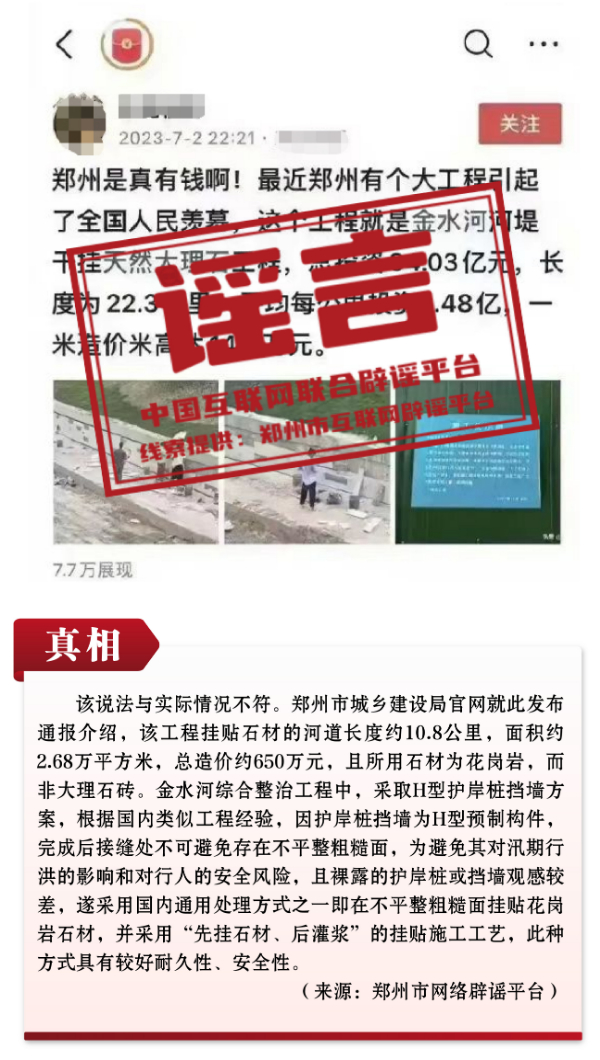 谣言7:郑州花34亿给22公里河道贴大理石砖?