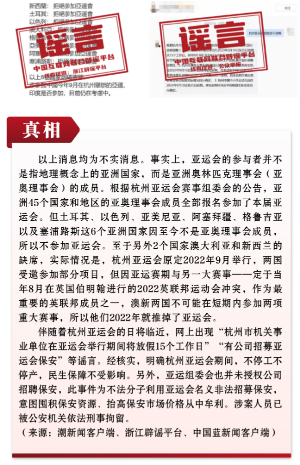 谣言6:八个国家宣布不参加杭州亚运会?杭州因举行亚运会将于9月10日至25日放假?