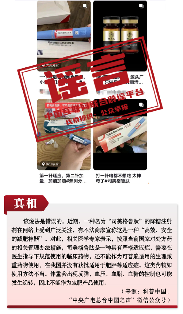 有关呼吸道疾病防治的谣言和误区误导公众。随着各地陆续入冬,呼吸道疾病进入高发季节,多种呼吸道疾病交织叠加,难免让人焦虑。恰在此时,网上一些治病养生医药“偏方”频出,一些自媒体假借专业人士和医生网上“开方”,真假难辨、误导公众。如“感染肺炎支原体会得肺炎、会出现‘白肺’”“可自行给孩子服用阿奇霉素等药物以预防支原体肺炎”“可网上购买‘医院同款’雾化器在家自疗”等谣言,抓住人们对疾病的恐惧心理大肆传播,有的耽误正常治疗,有的则是“假科普、真带货”。此外,“使用司美格鲁肽能轻松减肥”的谣言,无视权威部门对处方药的相关管理办法措施,此类药品若盲目使用或者使用不当,存在很大健康风险。