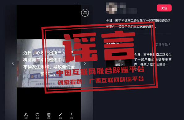 真相:近期,有网民在短视频平台上发布视频称“某派出所三人在路口巡逻中,突然车辆发生爆炸,导致三位民警全部牺牲”。经南宁公安部门调查,该信息为谣言。网民韦某为吸引关注,杜撰此条谣言信息,并利用手机进行发布。根据《中华人民共和国治安管理处罚法》第二十五条,属地公安机关已依法对韦某处以行政处罚。(来源:广西互联网辟谣平台、南宁网警)