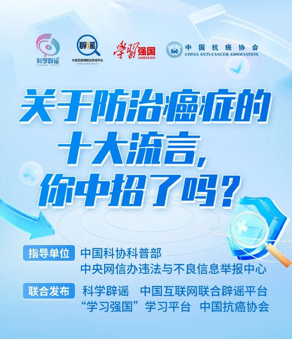 今天,科学辟谣联合中国互联网联合辟谣平台、“学习强国”学习平台、中国抗癌协会,针对10个广为流传的有关“防治癌症”的流言进行解读,快看看你中招了没?