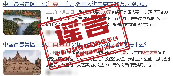 真相:近日,社交媒体平台上流传“新疆楼兰故城一张门票3500元”“罗布泊门票20元”等信息,甚至有网民给楼兰故城冠以“中国最贵景区”的名头,引发关注。对此,楼兰故城遗址所在地新疆若羌县“若羌文旅”官方账号辟谣称,“楼兰故城3500元门票”“罗布泊20元门票”的说法都是假的。楼兰故城从未对外开放过,广大游客若想了解楼兰文化,可以到若羌县楼兰博物馆进行了解。此外,罗布泊是无人区,禁止非法穿越。(来源:“新疆网络辟谣”微信公众号)
