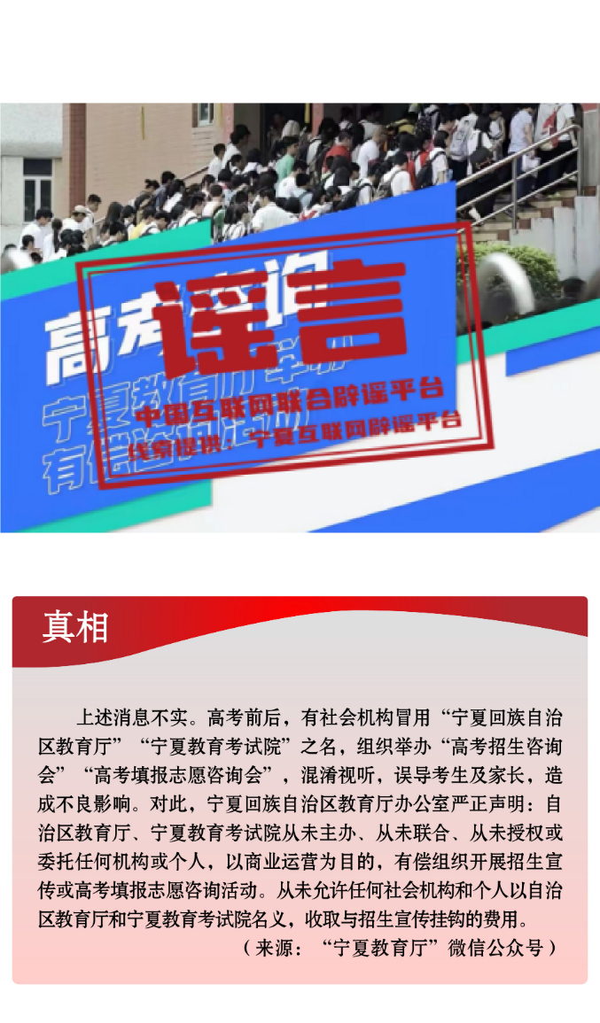涉高招中招类谣言多存诈骗风险,侵害群众利益。6月,中、高考落幕,毕业季开启。随着高招中招、求职招聘等话题日渐成为热点,相关谣言也潜滋暗长。一些社会机构抓住考生和家长“上岸”心切的心理,借机杜撰欺诈“台词剧本”,企图行骗牟利。如冒用官方名义发布“某地教育厅举办高考招生及志愿填报有偿咨询活动”“某大学向考生发送‘降分录取协议书’”“某地2024中考成绩已出”等通知、公告,实际均为不法分子编造的诈骗套路,误导考生和家长。又如,有机构和个人利用社交媒体、网站推送“只要缴纳高额费用,就能‘包过’职称评审”等虚假消息,利用个别求职人员想“走捷径”心态,实施欺诈,企图从中收取所谓“服务费”“代办费”“咨询费”等费用。还有个别网民编造涉考场秩序的不实信息,如“某地几所中学的中考存在作弊情况”“某地一考生考试中多次扭头成绩被判0分”等谣言,纯属子虚乌有,扰乱招考秩序。