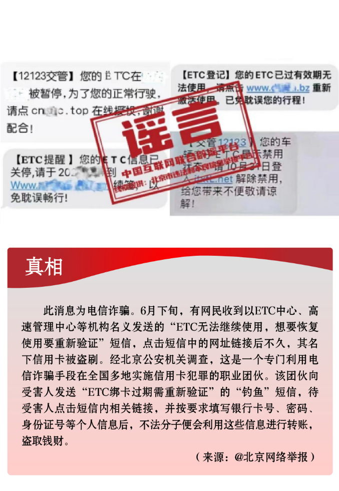 旅游出行类谣言增多,扰乱公众视听。6月,暑期临近、旅游旺季将至,涉及旅游出行等谣言信息亦随之增多。谣言“去云南旅游每人补贴3169元”严重歪曲云南旅游政策,纯属虚假宣传、诱骗公众;谣言“ETC绑卡过期需重新验证”实为不法分子精心设计的诈骗“钓鱼短信”;谣言“珠峰无限期关闭”“商家为赚补胎钱在独库公路撒钉子”或误解误读、或歪曲炒作,引发公众对当地文旅业的担忧和困扰。