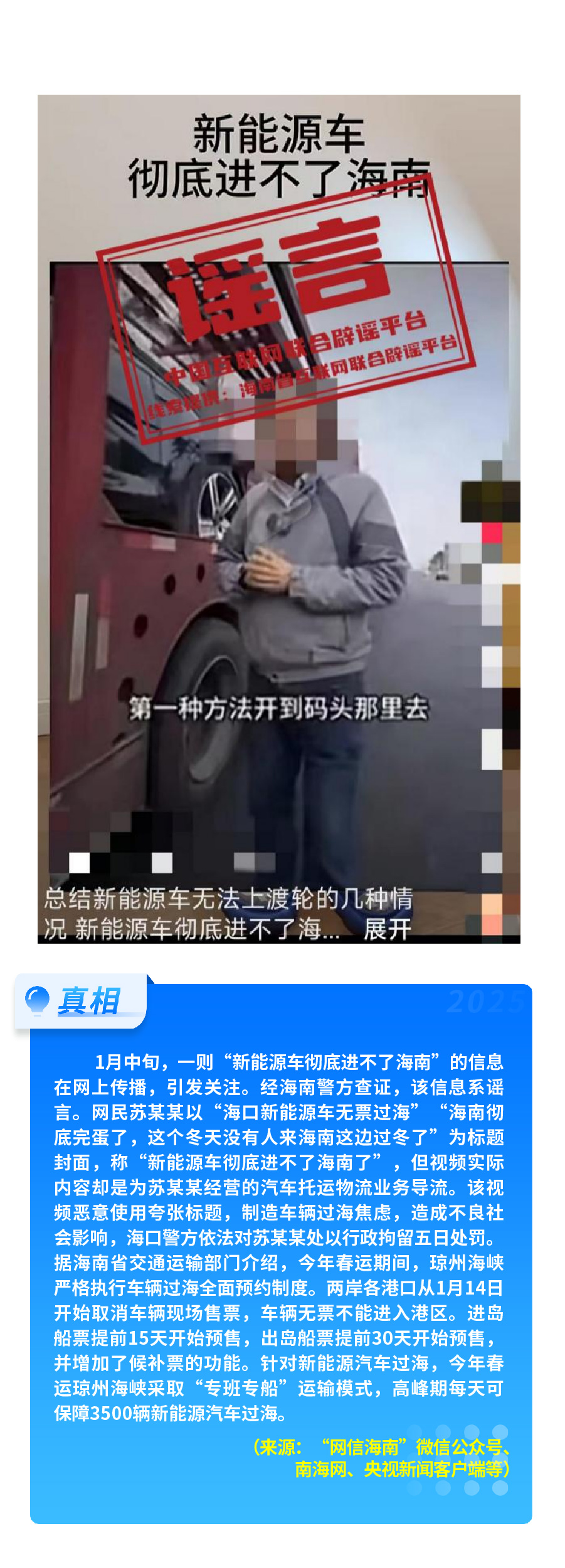 涉春节春运谣言影响节日氛围。1月恰逢新春佳节,个别不法分子却借机编造传播涉春节春运相关谣言,给喜庆祥和的节日氛围“添堵”。如春运高峰期,有人散布购票、出行等谣言,声称“购买‘加速包’可优先购票”“春运路上,山东聊城隧道多车相撞14人当场遇难”“新能源车进不了海南”,有意制造焦虑、误导认知。又如,个别网民或自媒体捏造所谓“2025年河南许昌、辽宁锦州允许燃放烟花爆竹”消息,歪曲相关地方政府通告内容。还有网民在春节前传播“山东青岛、新疆吐鲁番等地开展‘交警全城大检查’”等旧谣,此类谣言曾在全国多地传播且相关部门已多次辟谣,别有用心者仍冒用“交警大队通知”官方口吻再次传播扩散,造成不良影响。