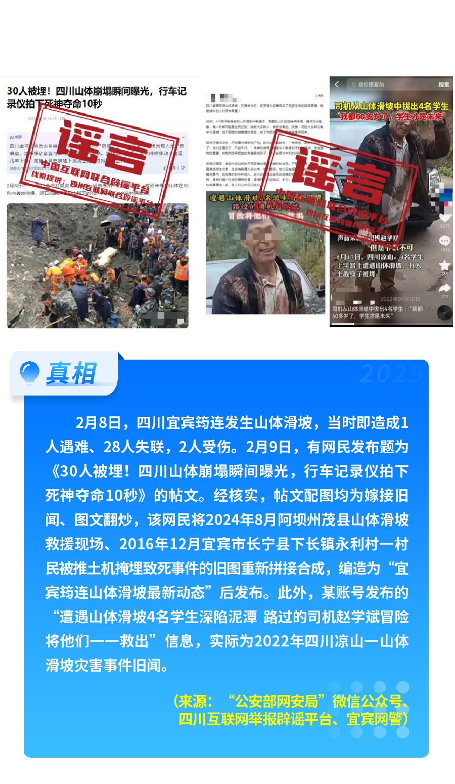 杜撰灾害事故谣言扰乱秩序。2月上旬,各类灾害事故频发,四川宜宾筠连山体滑坡、四川资中沼气爆燃等事件均备受社会关注,部分自媒体账号趁机散布谣言、博取流量。如“四川宜宾筠连山体滑坡被行车记录仪拍下”“4名遇险学生被路过的司机救出”等帖文,嫁接旧闻、翻炒拼凑,扰乱社会公共秩序,给抢险救灾工作带来极大困扰。“放鞭炮引起沼气爆燃的男孩面临580万赔偿”“男孩家属发布追责声明”等不实信息,系部分网民在并无事实依据情况下肆意编造传播,给当事各方造成伤害,产生不良社会影响。此外,还有网民随意散布“广州地铁三号线着火”“一架飞机坠落海南东方”“广东江门某码头两船相撞”等涉灾害事故类谣言,干扰正常社会秩序,给欢乐祥和的节日氛围蒙上阴影。