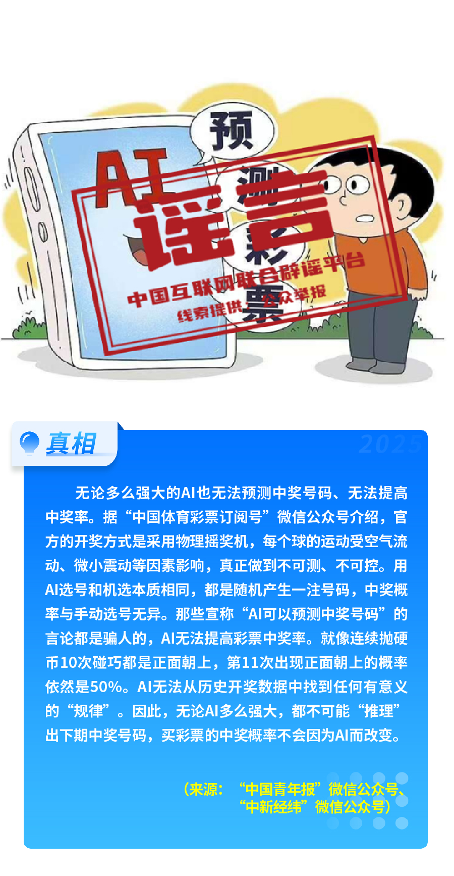 利用AI技术造谣混淆视听。近期,随着DeepSeek横空出世,各类AI应用爆发式增长,便利人们工作、生活的同时,亦有个别不法分子利用AI技术无中生有、设局行骗、炮制谣言。如有部分平台声称通过“大数据分析”或“AI模型”可预测彩票中奖号、提高中奖率,诱导用户付费或点击外链,违法行径严重侵害消费者权益,中国体育彩票迅速辟谣“再强大的AI也无法预测中奖号码”。新疆库车5.0级地震发生后,部分自媒体账号为博眼球、蹭流量,利用AI技术手段生成与此次地震不符的图片,在网上发布“库车市地震导致多处房屋倒塌”的图文、音视频等虚假信息,严重误导公众认知。还有个别网民利用AI技术生成涉校园“火灾”特效,编造“河南清丰县第二初级中学着火”“云南迪庆香格里拉一中、三中着火”“山西忻州市某中学发生火灾”等虚假信息,严重混淆视听。